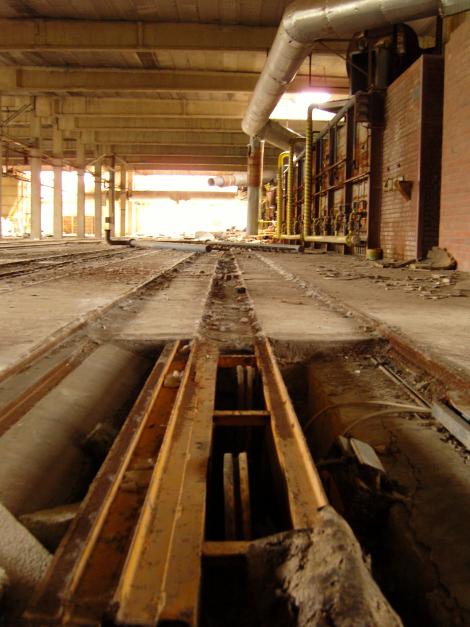 ausgebrannt, die großen Hallen, teils noch mit den Brennöfen für die Keramik