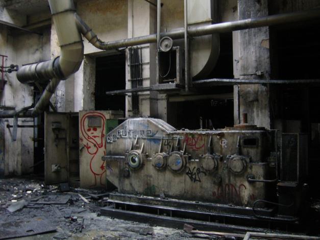 den Fabrikgebäuden laufen. Das graue, regnerische